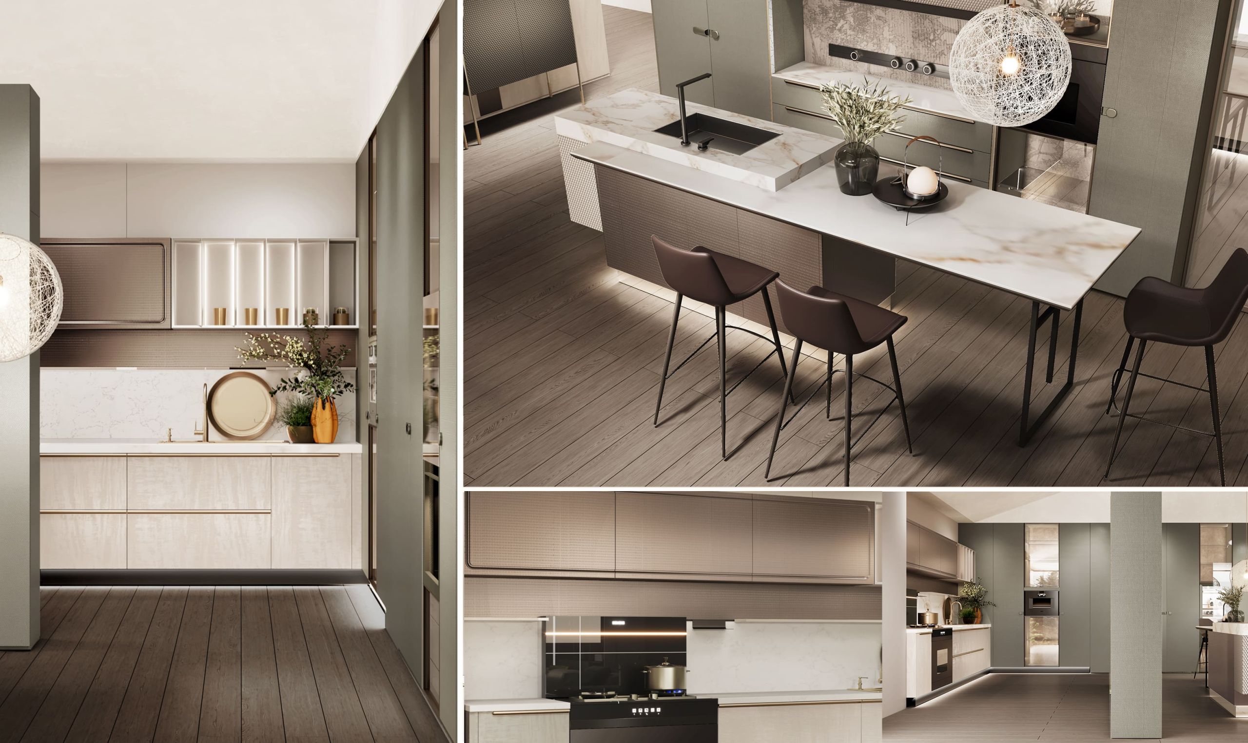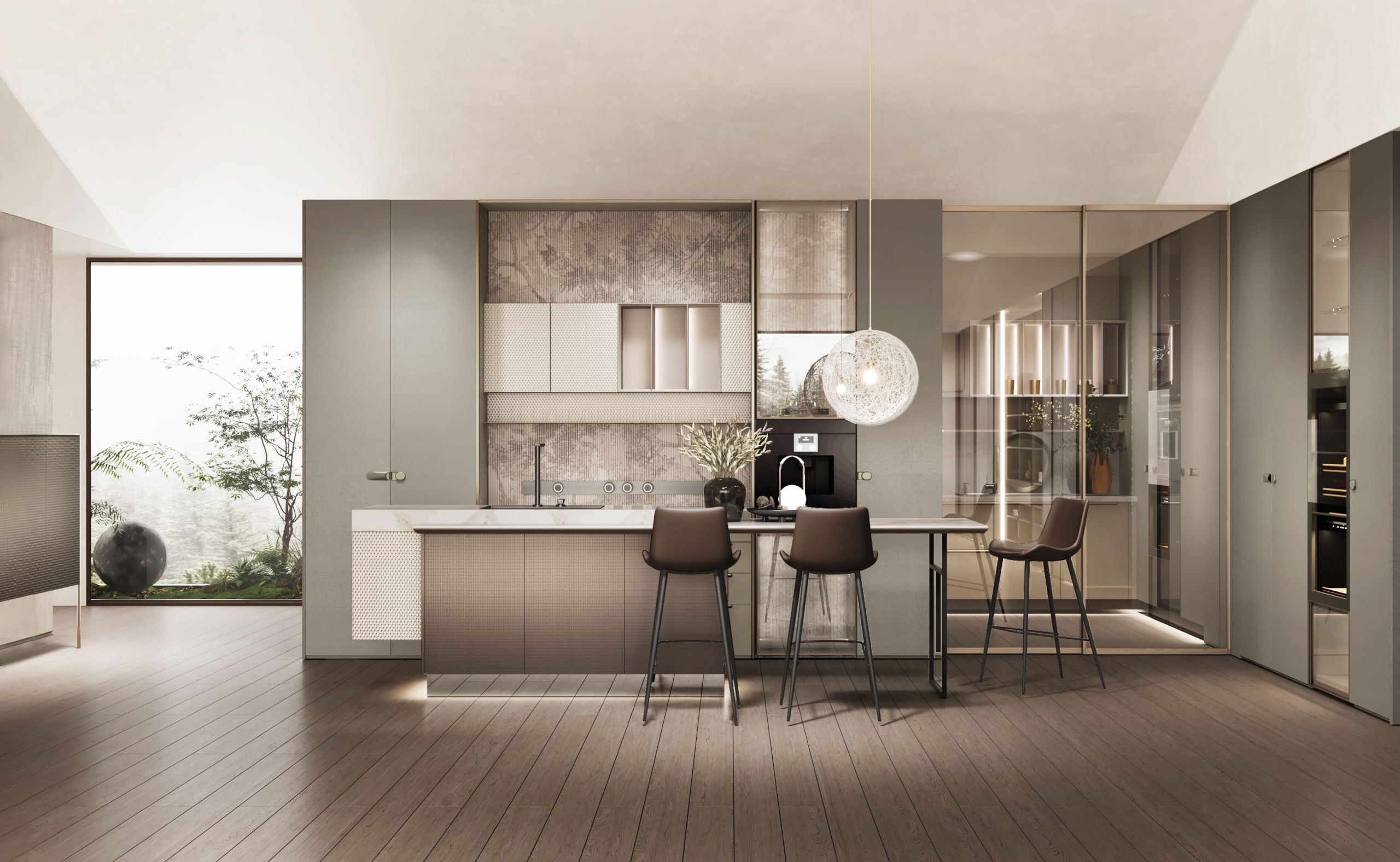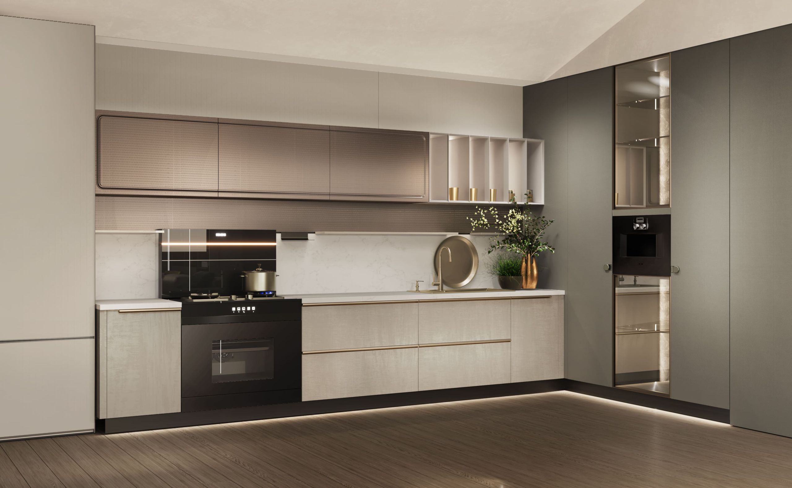 This kitchen cabinet design displays a sophisticated and modern aesthetic. The color palette is predominantly composed of neutral tones, with a predominance of shades of gray and warm beige hues. This creates a harmonious and calming ambiance, lending a sense of refinement to the space.