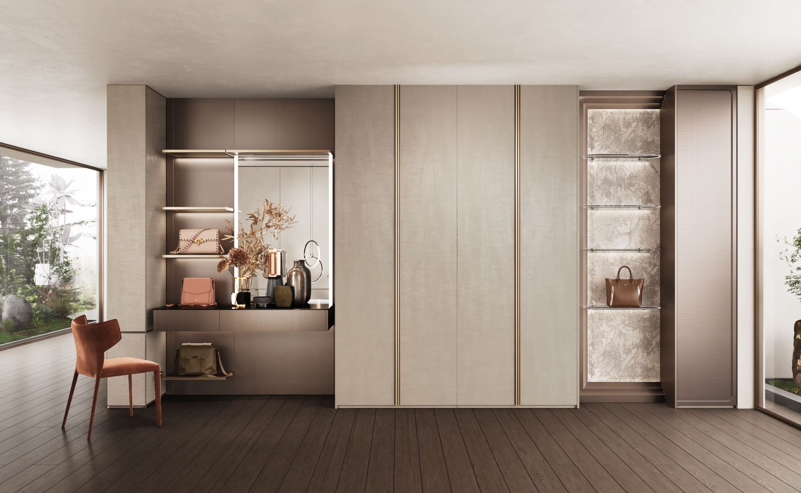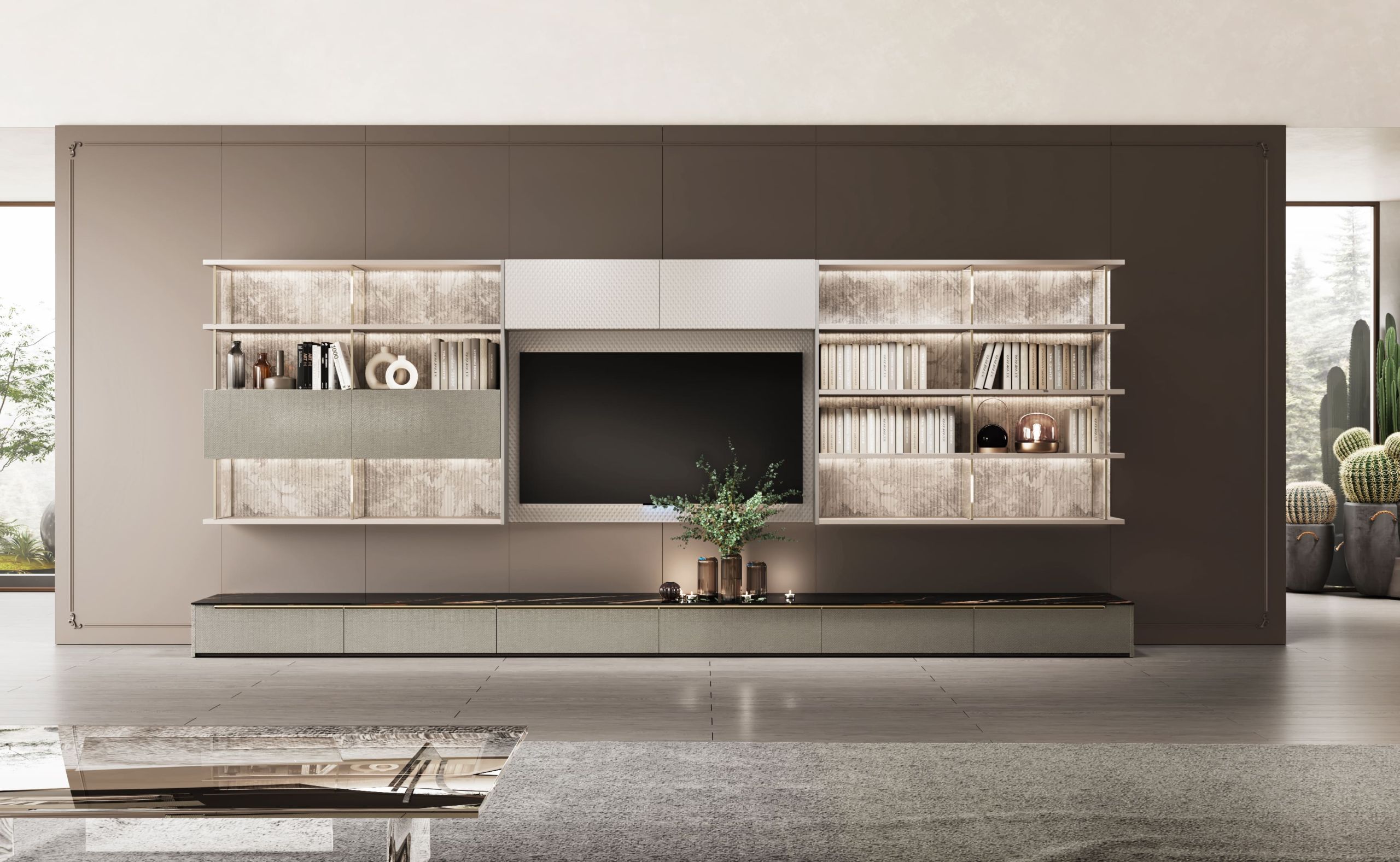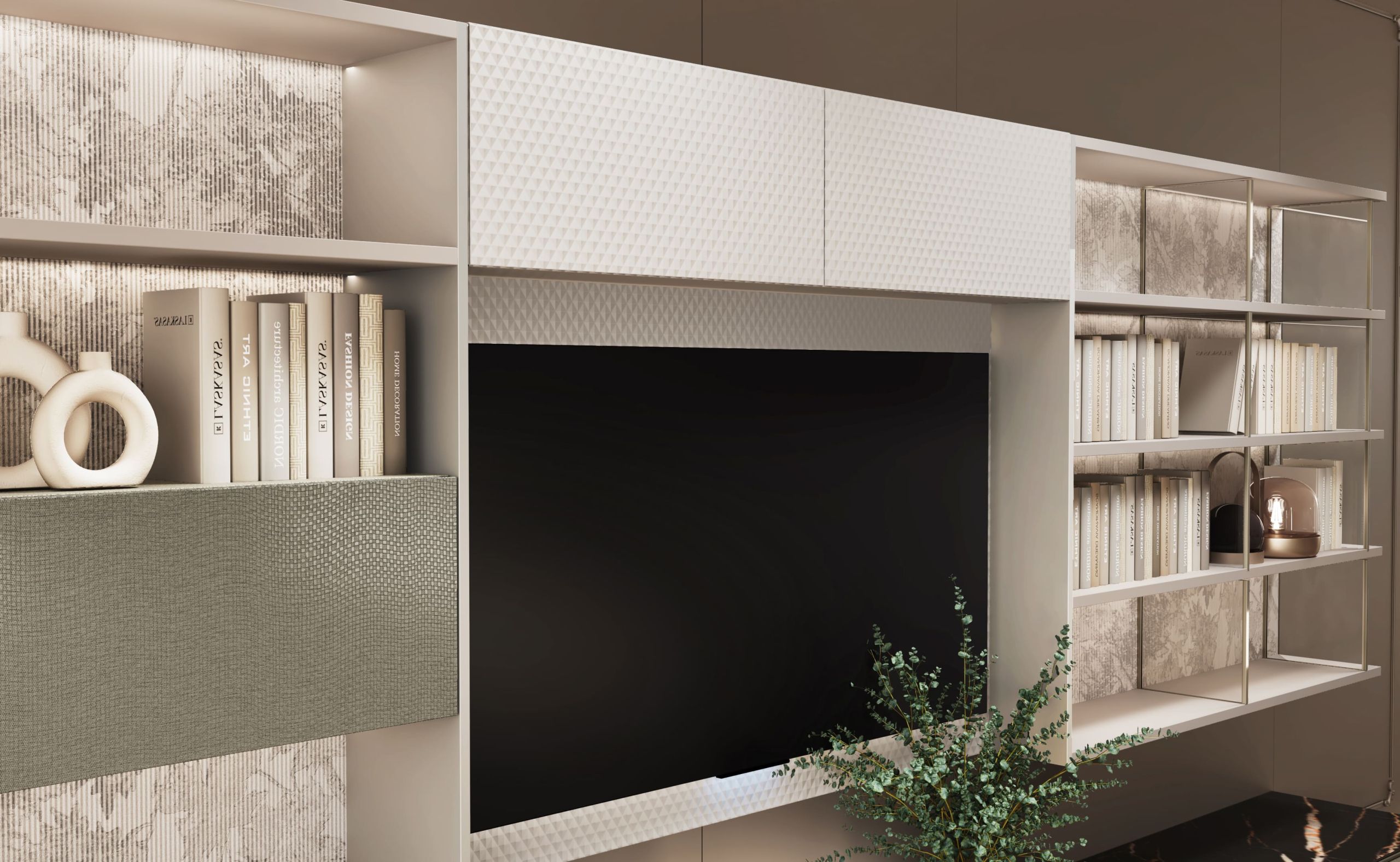 The overall atmosphere of this living room design is very elegant. From the color point of view, a large number of neutral tones, such as beige, light curry, etc., to create a calm and elegant atmosphere. Furniture and decorations also follow this main color, such as a dark brown TV cabinet, beige sofa, and cushions, forming a harmonious and unified visual effect. Furniture and decorations reflect a minimalist aesthetic pursuit without too many decorative elements, focusing on the combination of form and function. At the same time, the spatial layout is also very reasonable, highlighting the open design concept so that the entire living area is coherent and natural.