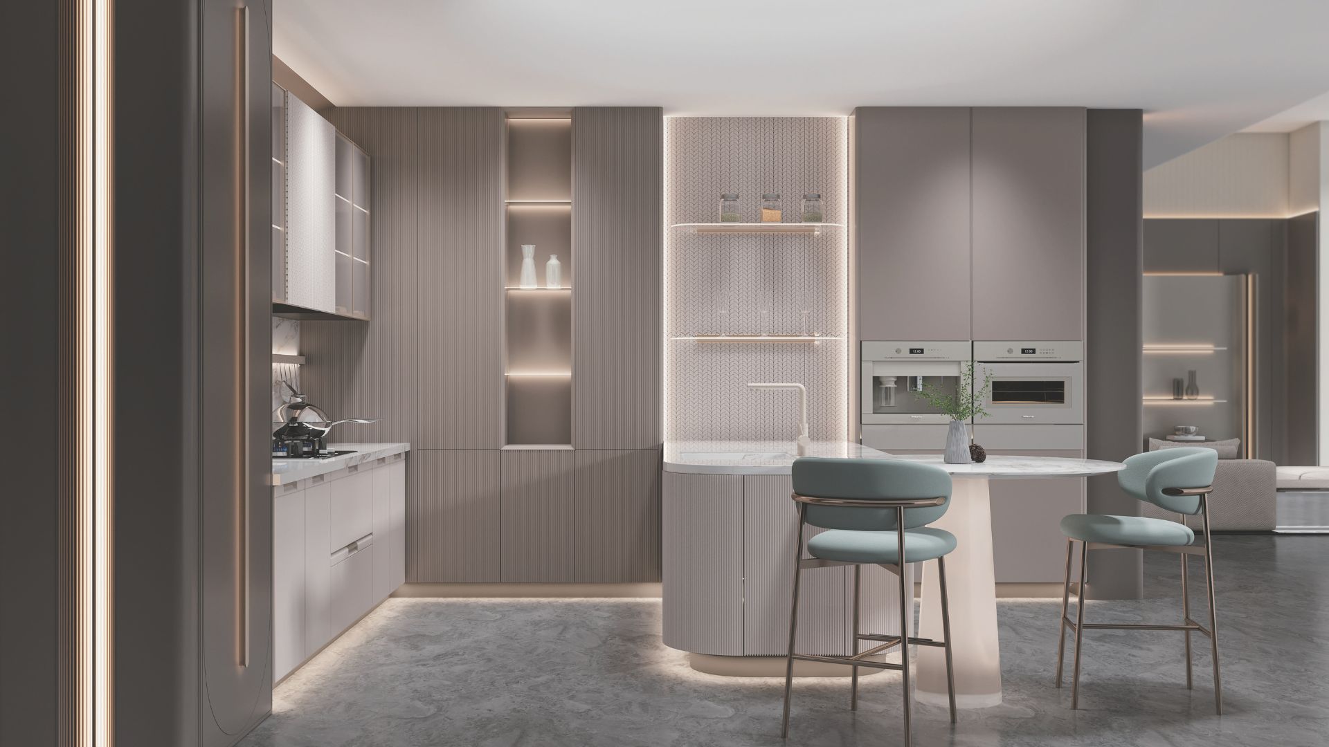 This modern kitchen design is called MOQI and has a sleek and contemporary style. It features built-in appliances, handle-less cabinets, white countertops and a neutral color palette of taupe and brown accents. The kitchen is designed with a minimalist aesthetic with clean lines and a layout that is both functional and stylish. The cabinets also come with a breakfast table, making the most of the kitchen space.