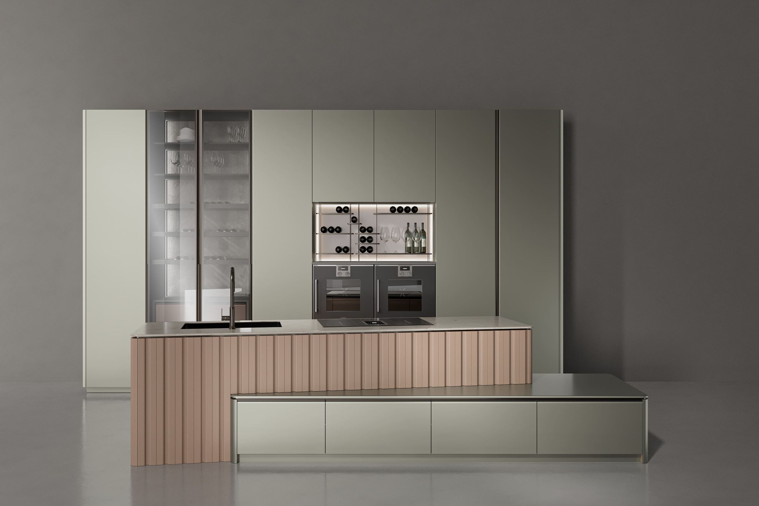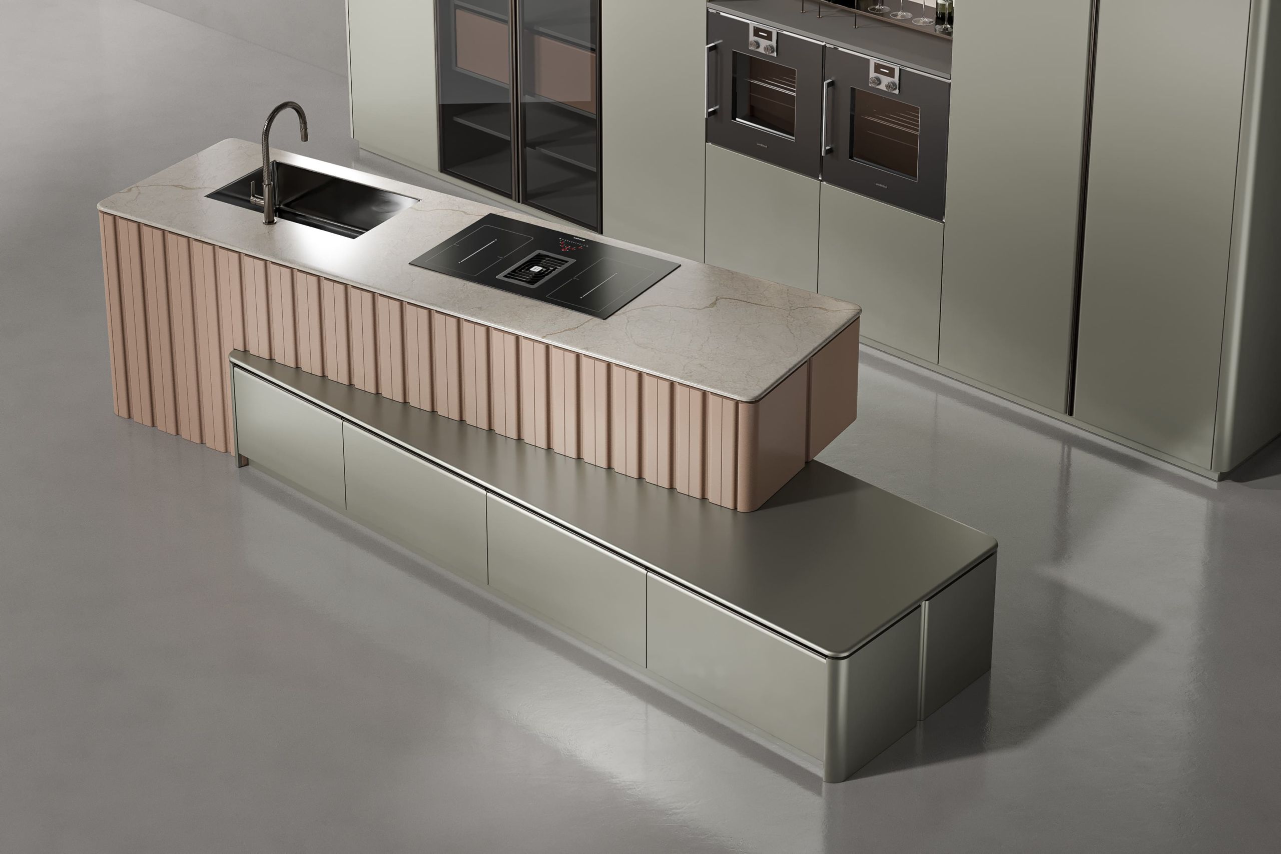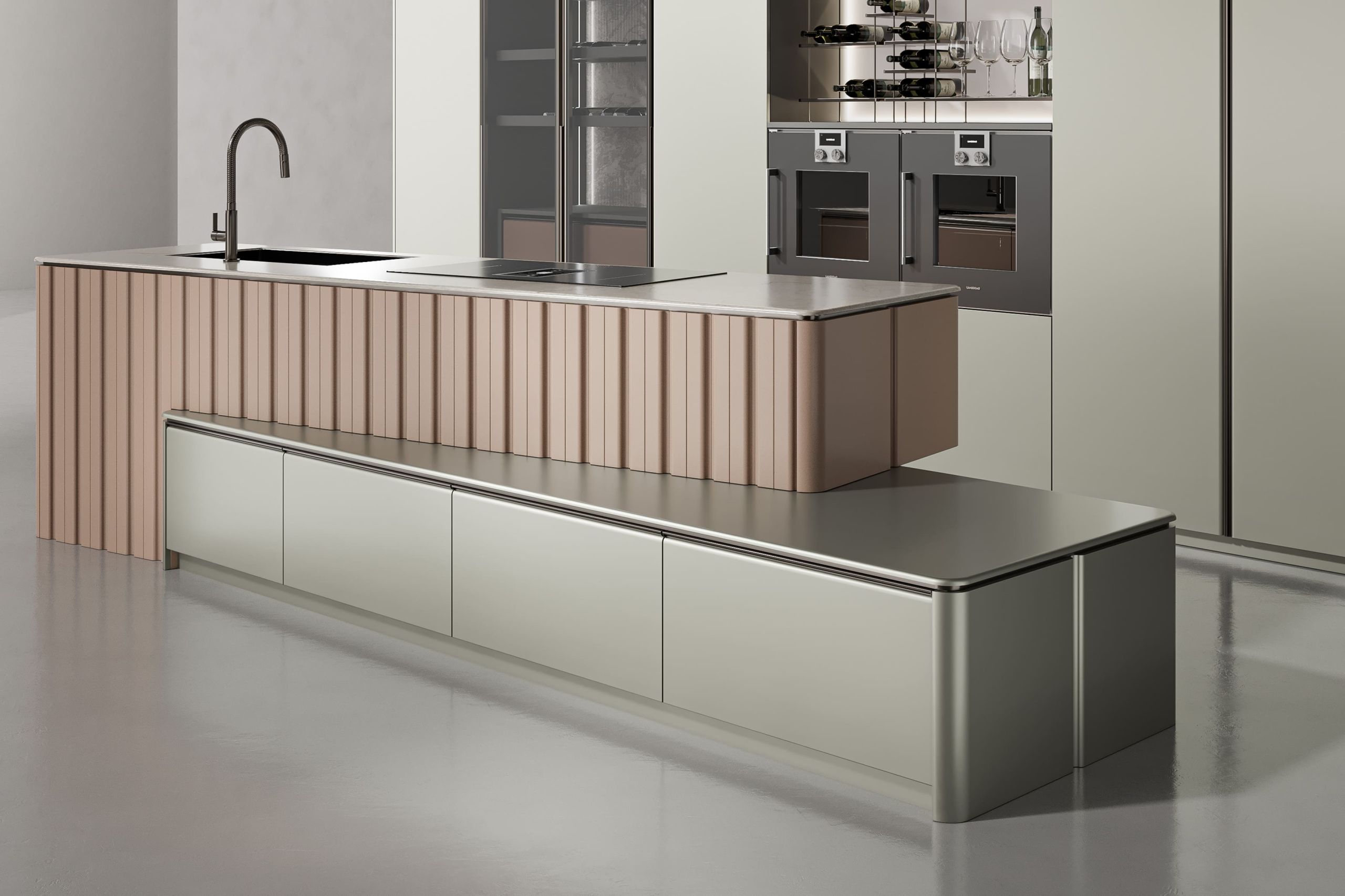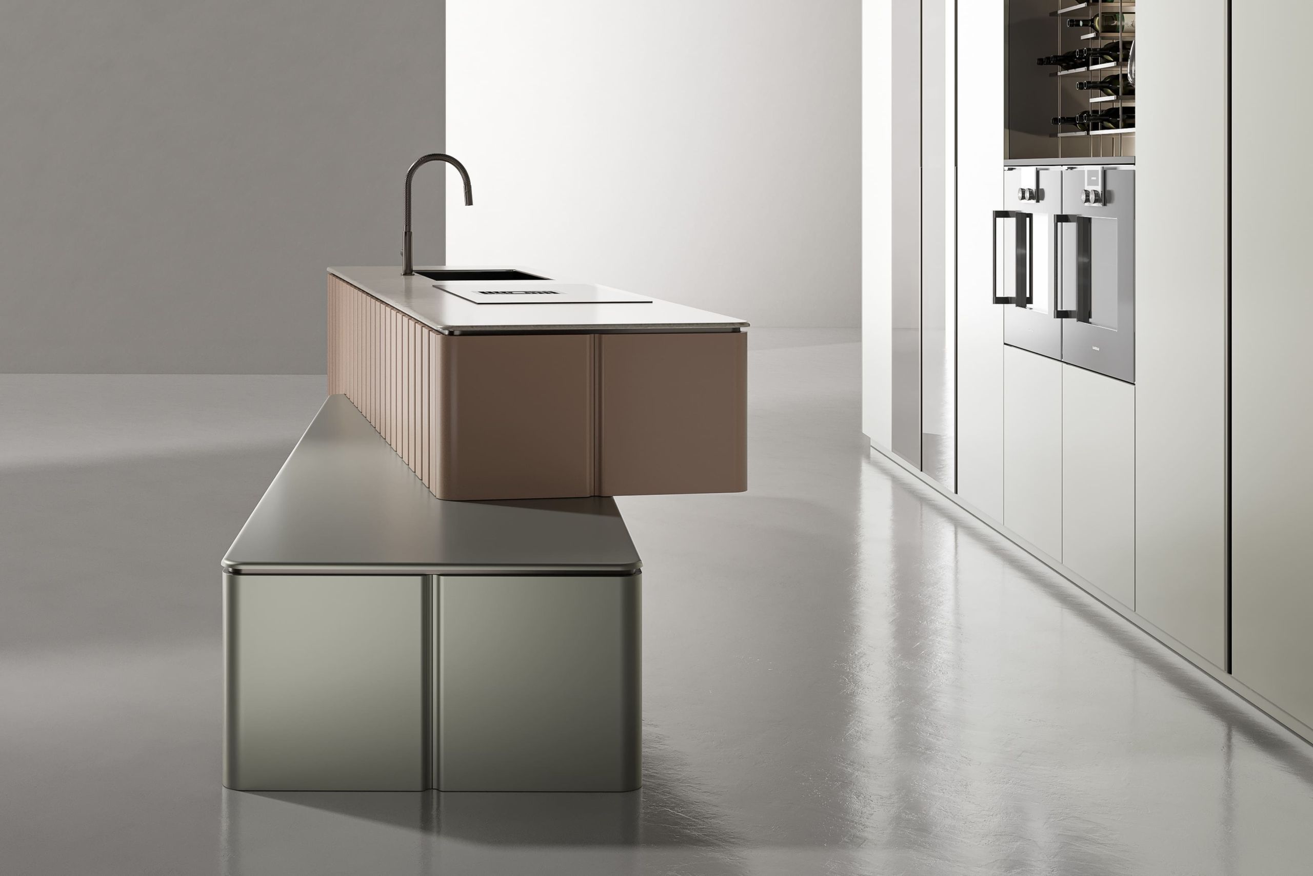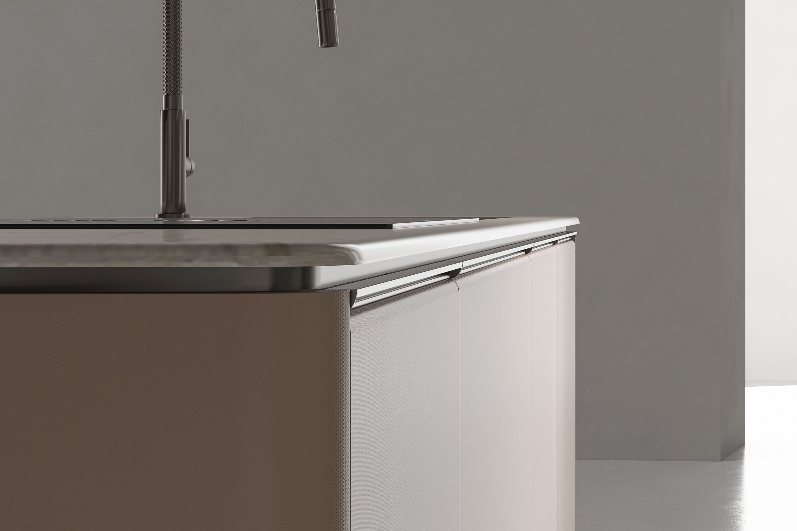This kitchen cabinet collection is Patti and features a minimalist design. The color palette is based on neutral tones, including gray, beige, and metallic sheen. On the left side, there is a center kitchen island with a built-in sink and high arch faucet. The front of the island is designed with a light beige vertical stripe, and the countertop extends to form a breakfast island counter in white. The irregular kitchen island stacking design is what makes this collection outstanding.