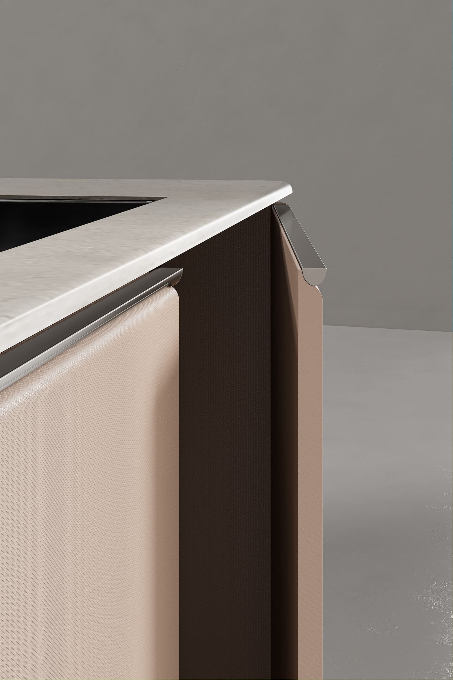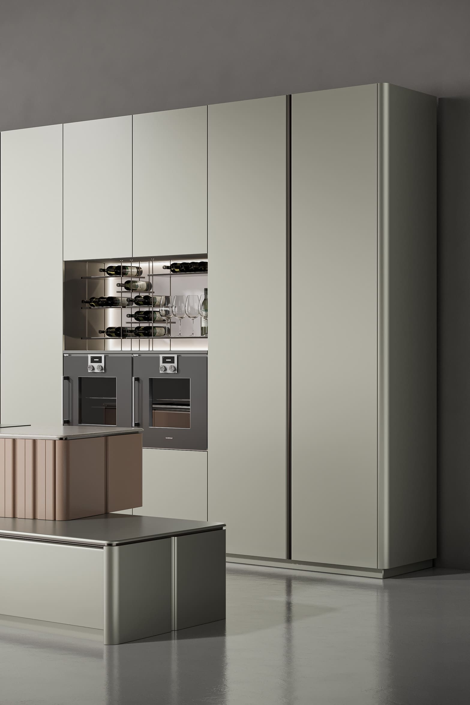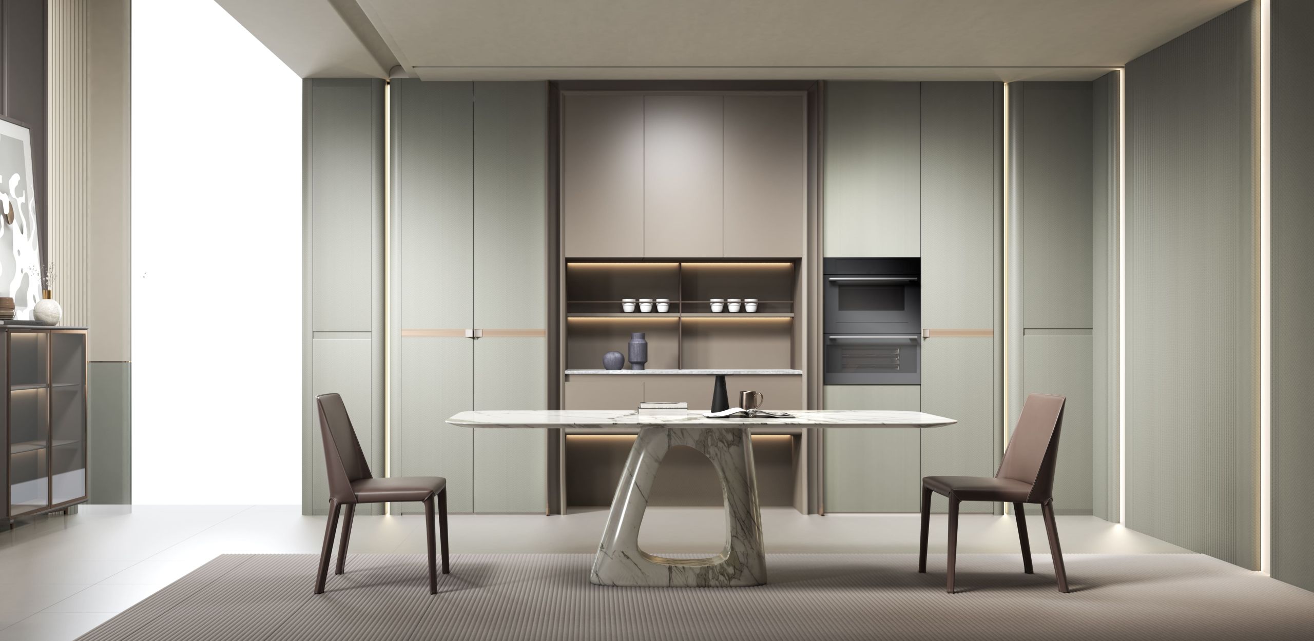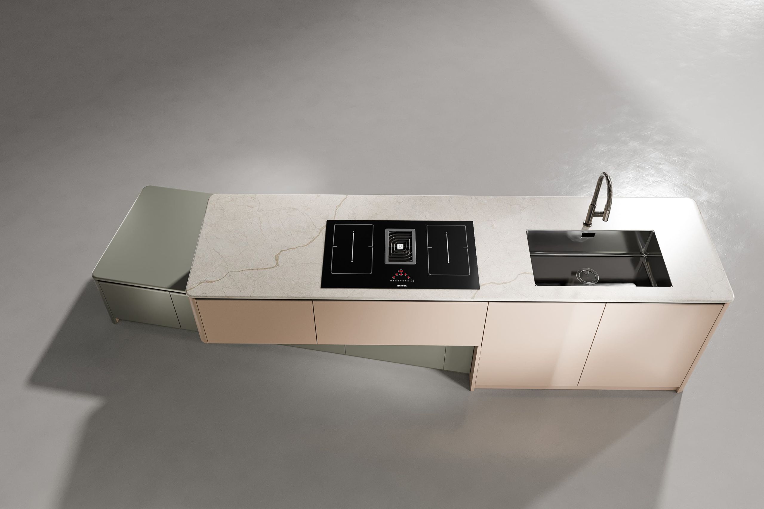 This kitchen cabinet collection is Patti and features a minimalist design. The color palette is based on neutral tones, including gray, beige, and metallic sheen. On the left side, there is a center kitchen island with a built-in sink and high arch faucet. The front of the island is designed with a light beige vertical stripe, and the countertop extends to form a breakfast island counter in white. The irregular kitchen island stacking design is what makes this collection outstanding.
