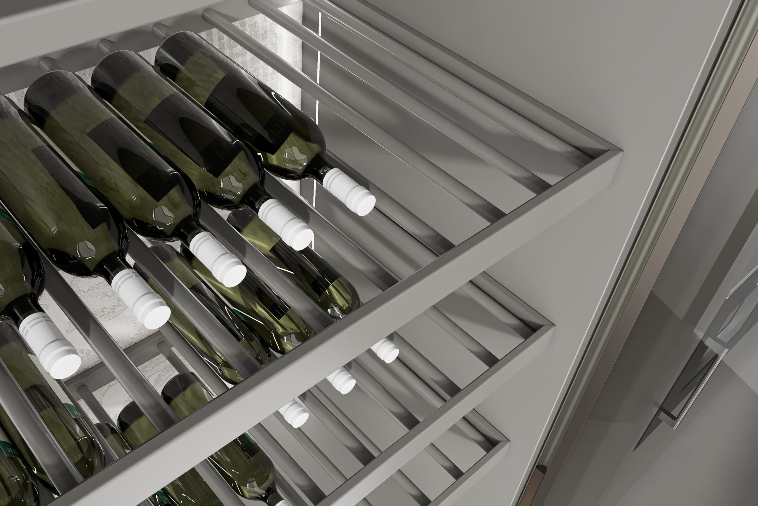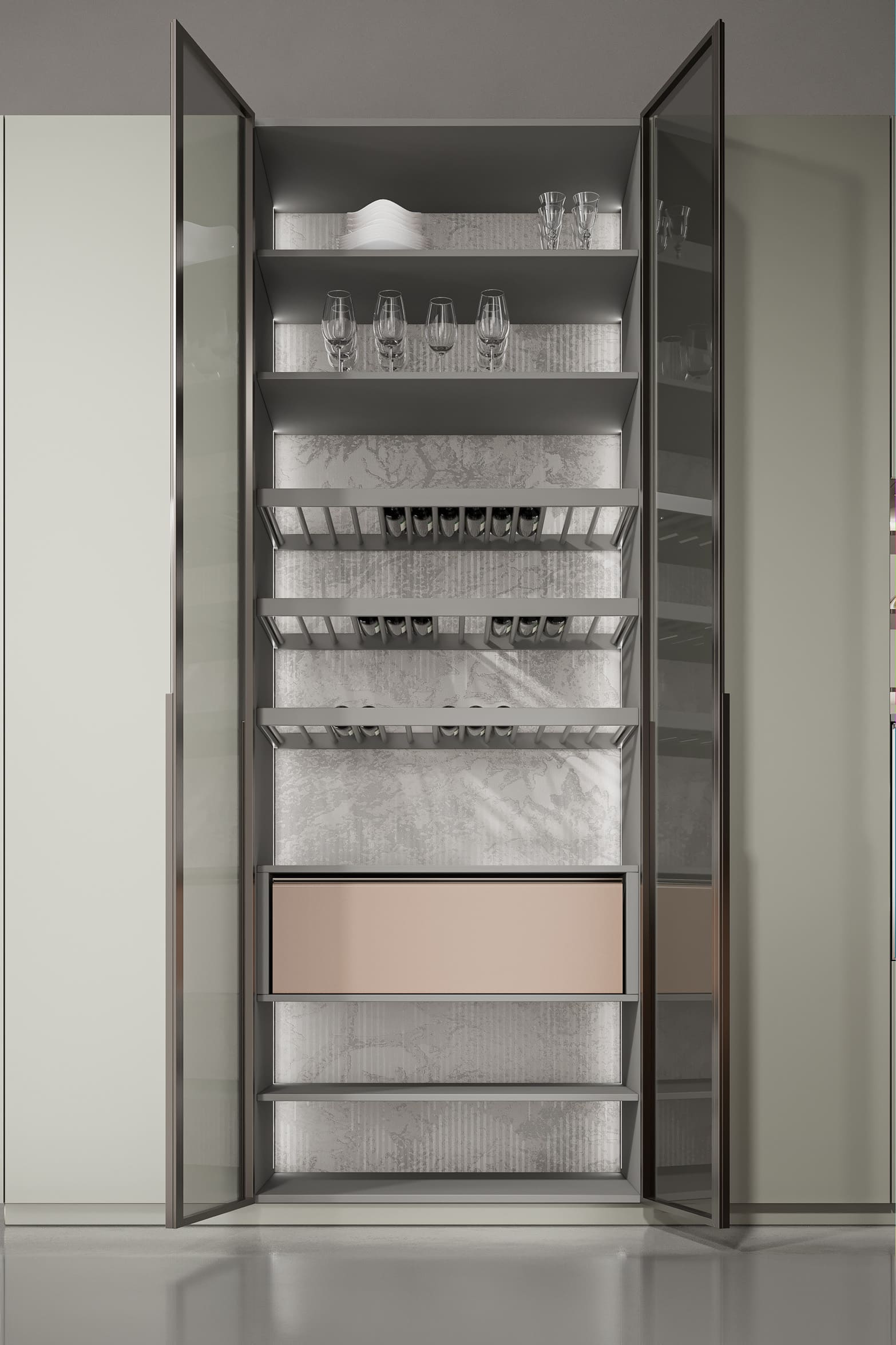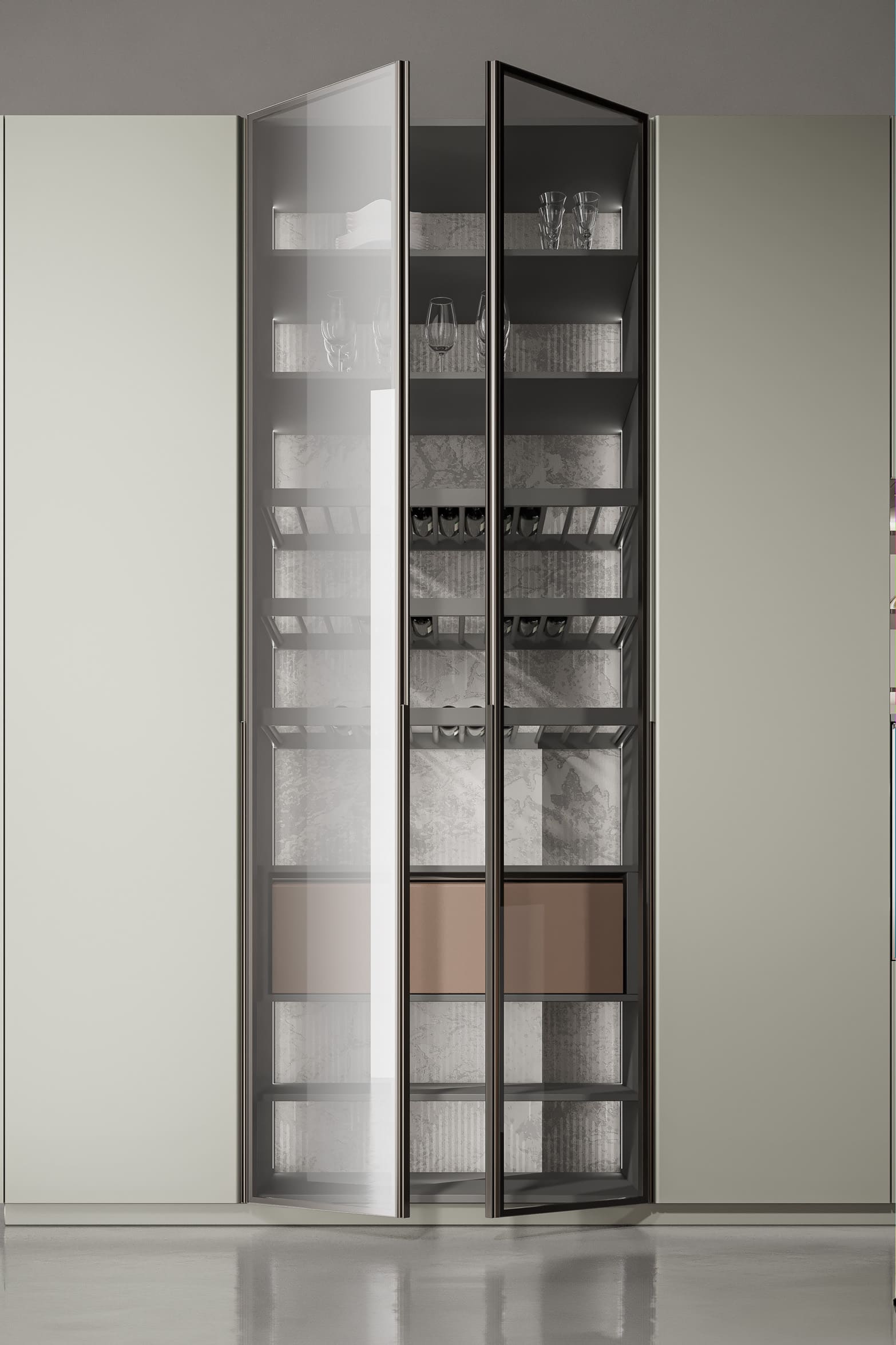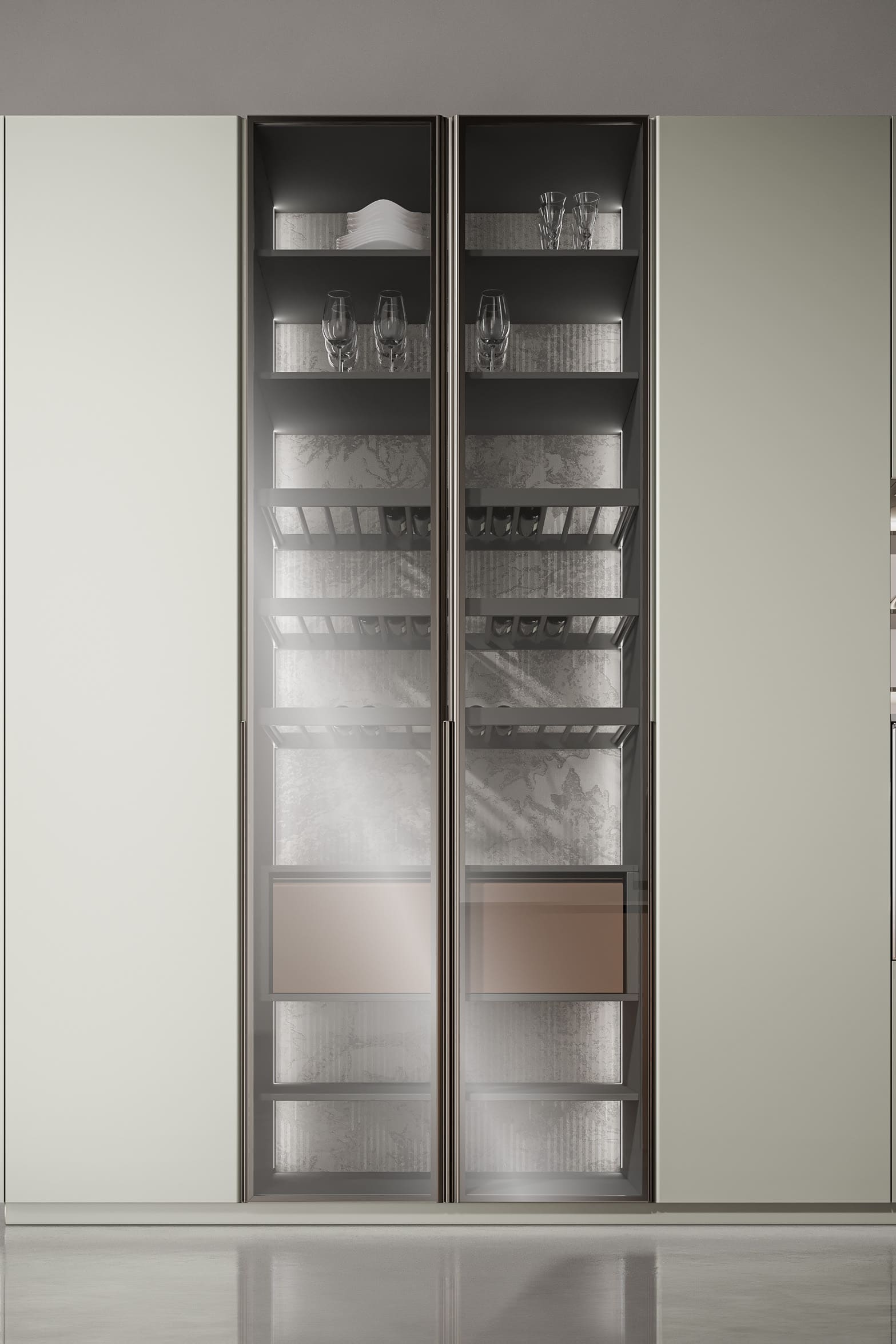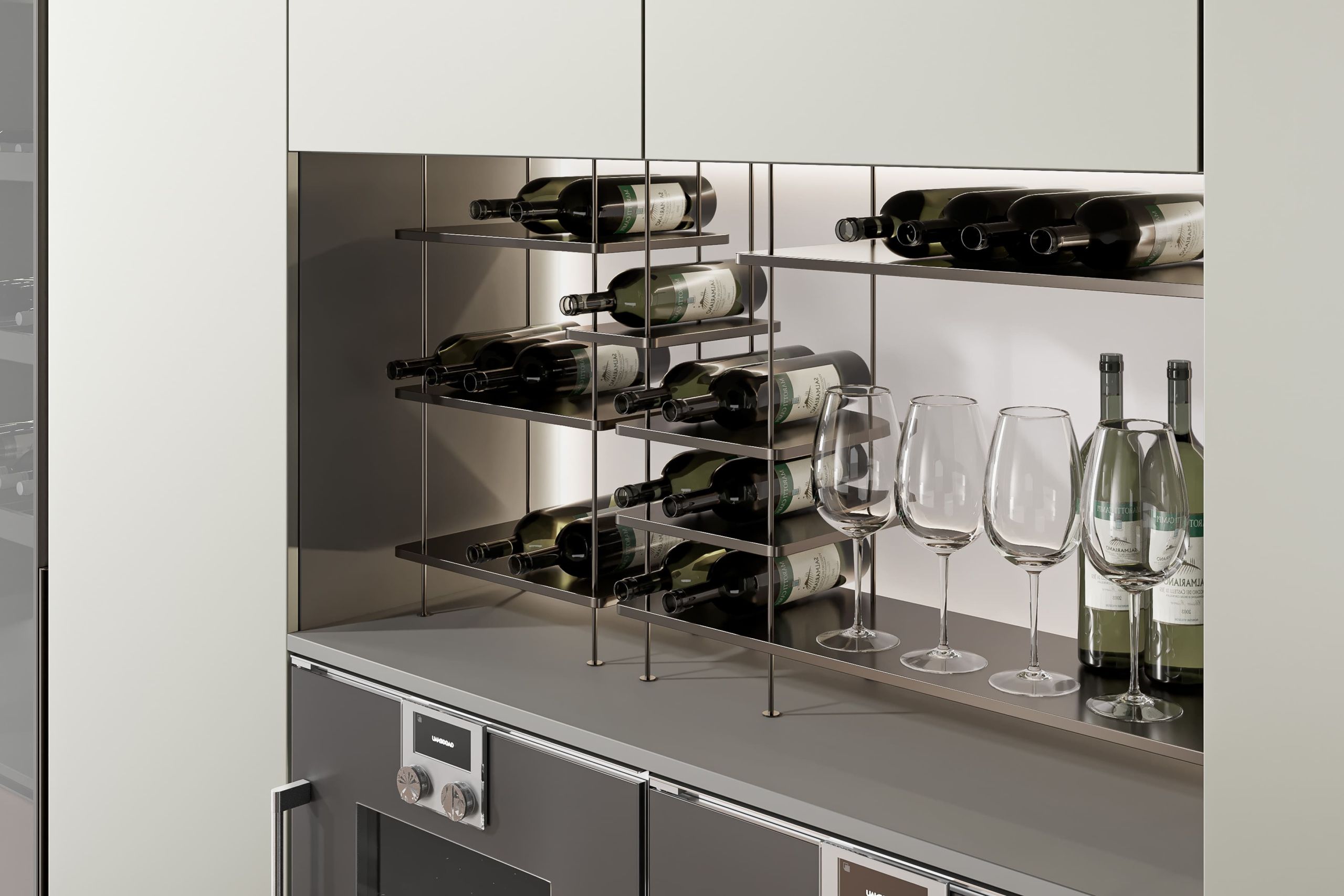 This kitchen cabinet collection is Patti and features a minimalist design. The color palette is based on neutral tones, including gray, beige, and metallic sheen. On the left side, there is a center kitchen island with a built-in sink and high arch faucet. The front of the island is designed with a light beige vertical stripe, and the countertop extends to form a breakfast island counter in white. The irregular kitchen island stacking design is what makes this collection outstanding.