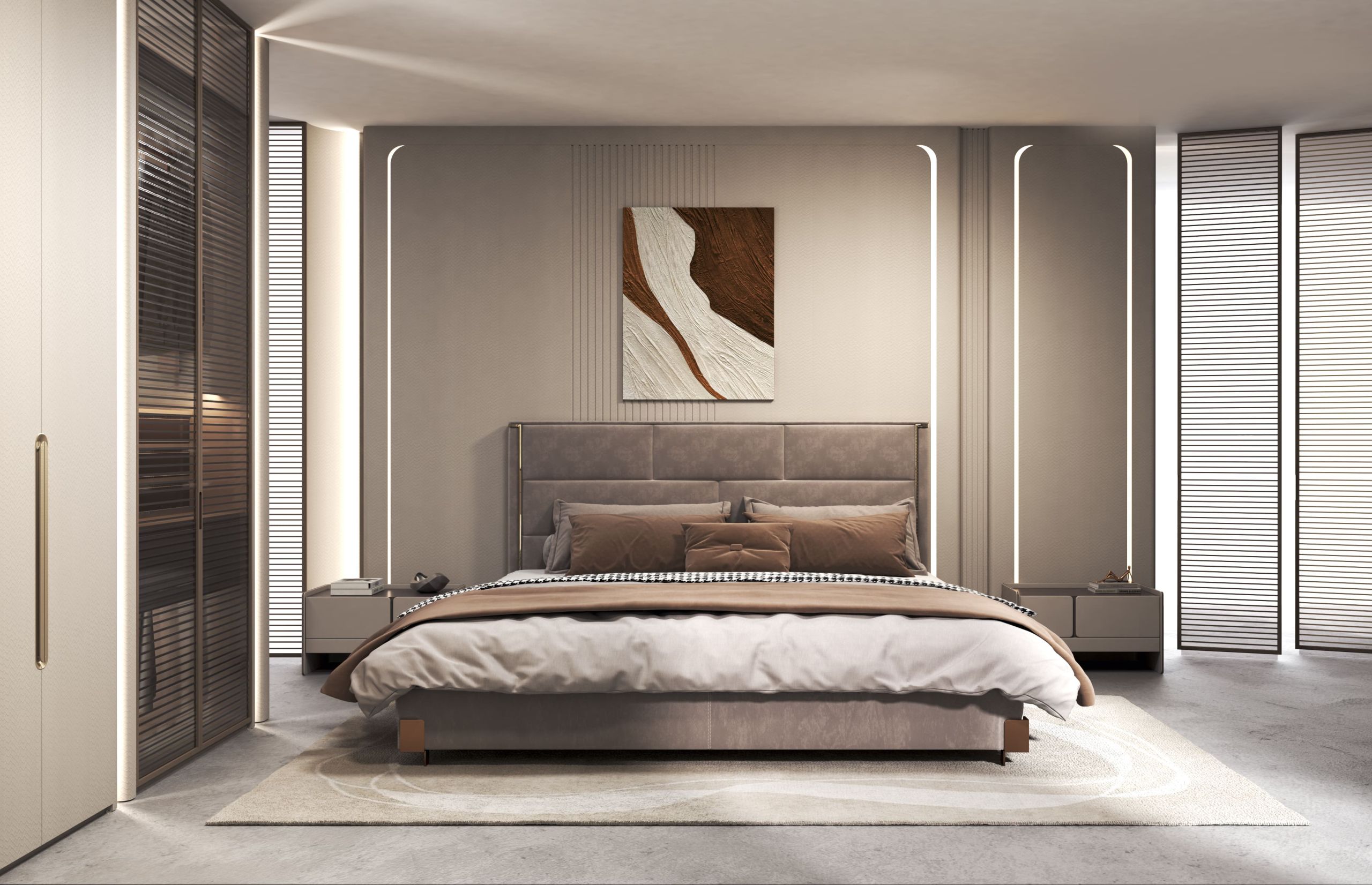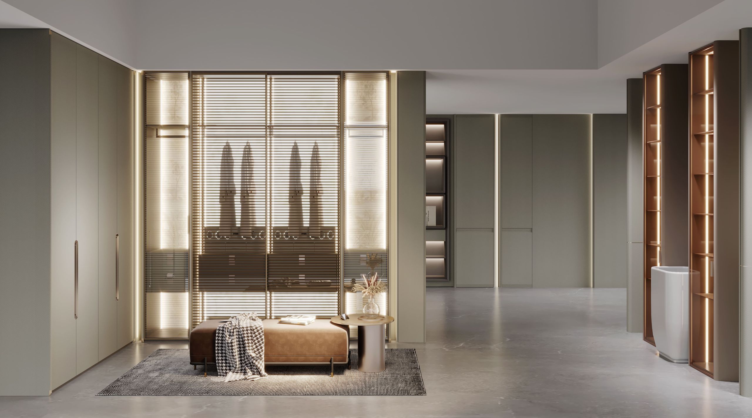 The bedroom features a neutral palette of beige, brown and gray, giving it a modern and sophisticated feel. On the left side is a large built-in closet with beige doors and long vertical handles. The entire room exudes a clean and crisp aesthetic that emphasizes texture and subtle patterns. Soft ambient lighting accentuates the peaceful and relaxing atmosphere of the space. The other room is laid out with a modern and stylish walk-in closet. The space has a minimalist design with smooth lines and a neutral color palette. It features open plan closets, a central island, windowed closets, polished flooring and integrated lighting.
